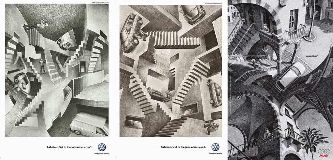 Seguimos con otros ejemplos de Volkswagen basados en "Relativity" que complementamos con otro anuncio automovilístico, en este caso de Audi, basado en un concepto visual similar.
