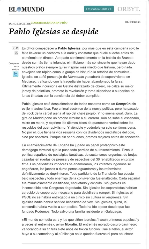 No es menor traca final de campaña la no desmentida filtración de la vuelta a la televisión del candidato de Podemos. Eso sí que compromiso con los votantes que ni siquiera han depositado todavía su papeleta. Categoría "yo no me iré del barrio". JM Esteban apunta "Supervividores" como título de un posible reality sobre socialismo utópico y G. Morán se encarga de recordar las denostadas puertas giratorias. Como ostensible prueba de que son muchas las ocasiones en que las imágenes no puden competir con las palabras, en nota al pie [2] reproducimos el demoledor "Pablo Iglesias se despide" de Jorge Bustos.