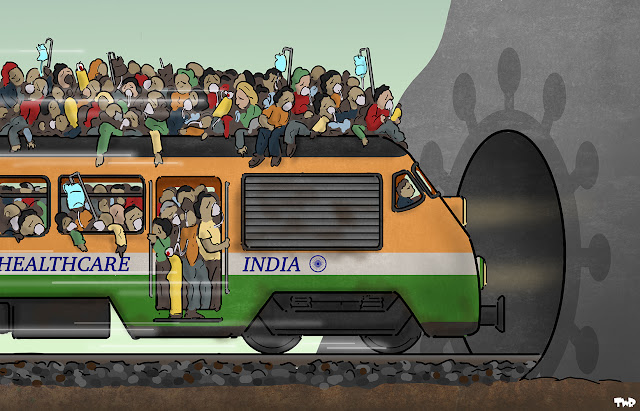 Las características representaciones de las deidades hindúes con múltiple brazos, en este caso con Shiva Nataraja (Señor de la Danza) como inspiración, destacan en los dibujos de Monsieur Kak y Santy Gutiérrez, mientras que el dibujante indió Sumanta Baruah centró en la colosal 'Estatua de la Unidad', un monumento que se trata en el apunte El nuevo récord constructivo que se oficializa mañana, su crítica de las carencias que ha mostrado el sistema de salud de su país.