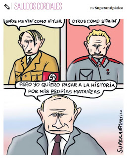 Vueltos a la guerra de Ucrania, proseguimos con la ironía de Patrick Blower sobre la pobre imagen que está dando la supuestamente poderosísima maquinaria bélica rusa. Una circunstancia que Victor Juhasz aprvechó para poner flácido contrapunto al humor fálico sobre Putin que todavía recibía ayer con una aportación de Ferreres. Completa el bloque la dual visión Hitler- Stalin del criminal dirigente ruso publicada en '20 minutos' por Superantiático (Juan Aparicio Belmonte).