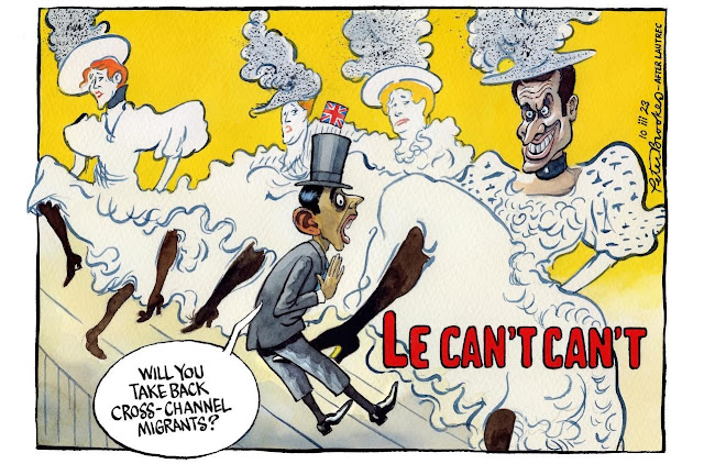 En el apunte del lunes ya dimos cuenta, con el compromiso de volver sobre ella, de una viñeta de Peter Brookes publicada el día 10 en The Times sobre las discrepancias entre el Reino Unido y Francia en relación con la contención de la inmigración ilegal y, más concretamente, sobre la devolución de los que consiguen cruzar el Canal de la Mancha. Un dibujo que hace una espléndida parodia, protagonizada por Rishi Sunak y Emmanuel Macron, del cartel "La Troupe de Mlle. Églantine" de Henri de Toulouse-Lautrec (1864-1901).