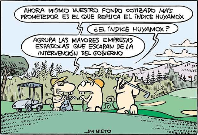 Volvemos al humor con la tira de Javier Cuervo y Pablo García en La Nueva España que hace un paronímico juego entre la "Ley sí / dí sí" y la pronunciación original en inglés del nombre de la banda de hard rock AC/DC. Sigue la viñeta del ayer de JM Nieto, seguramente el más ludolingüista de los humoristas de prensa, que da cuenta del novedoso "Índice Huyamox". Y añadiremos que el artículo 'Ferrovial: salida, voz, lealtad' de Manuel Conthe nos parece una muy recomendable lectura sobre el tema de fondo.