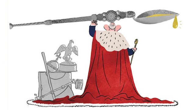 Adenda: Steve Bell desvela el martes 9 la unción que trata Murado al comienzo de este apunte, única parte de la ceremonia que no es visible para los asistentes. Y ya se ve que el dibujante de diario The Guardian omite la ceremonial cuchara cuyo papel se explica en el enlace que hemos insertado al comienzo. Mark Knight dio una bien diferente visión del uso del biombo y David Parkins aporta una magnífica versión de la carroza Gold State. Enlazamos, a modo de complemento, un resumen de la ceremonia comentado a la andaluza.