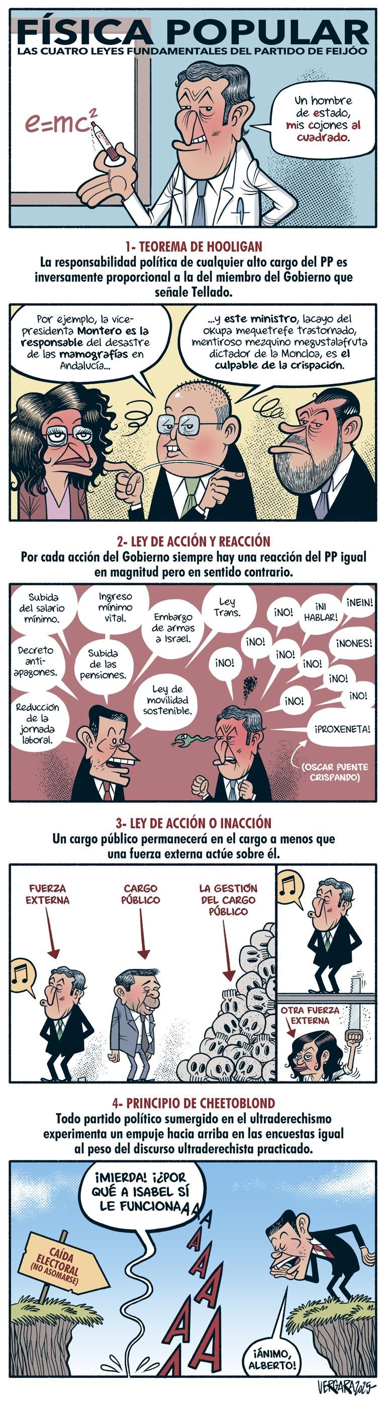 La tira de Fontdevila es un más de lo de siempre contra el PP en la que no falta la enésima viñeta que este dibujante tan dado al propagandismo aporta al recopilatorio Ayuso como amenaza para Feijóo. Su viñeta ordinaria es una alucinación sobre la declaración ante el juez de Miguel Ángel Rodríguez (que sí que tenía otra miga humorística con la asunción de que se inventó cosas). Sigue Maduro en la tira de Javi Salado, Mohamed VI en la del siempre demorado Ferreres, una pieza de Idígoras sobre la inminente factura electrónica y una ironía de JL Martín sobre los reiterados aplazamientos de la vuelta del Barça a su campo.