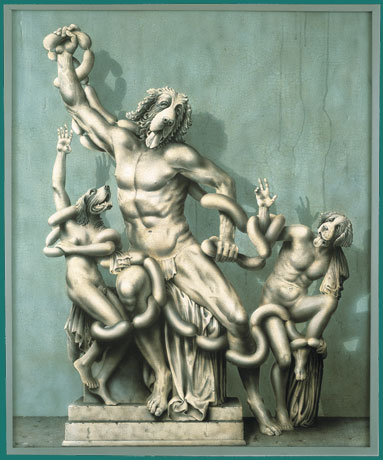 Menos conocido que los artistas anteriores es Mathias Waske, pero nos ha gustado su perruna versión "Laocoonte I" (1989). Si se dan una vuelta por su web comprobarán que este artista es un apropiacionsita recalcitrante que se ha especializado en fusionar referencia a diferentes artistas, en este caso combinando el clásico griego con las caninas escenas que dieron fama al pintor C. M. Coolidge.