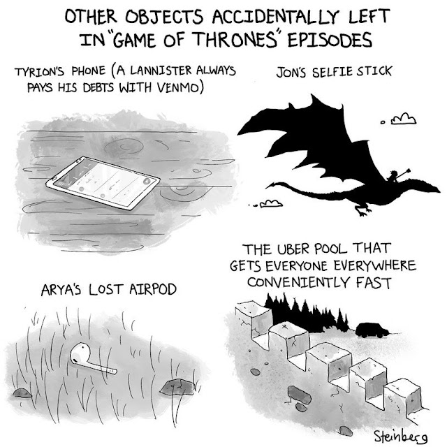 El famoso café de Starbucks, pronto suprimido digitalmente, que se coló en una escena de 'Juego de Tronos', inspiró al dibujante Avi Steinberg una viñeta para The New Yorker en que ideó otros hipotéticos objetos accidentalmente olvidados. Más allá de alguna posible incomprensión cultural por nuestra parte, nos parece más acertada la idea que la ejecución. Debajo puede verse la guía para no iniciados en esa serie realizada por Bob Moran con algunos destacados políticos británicos. Sobre la misma procede aclarar que la censurada interjección que profiere el ave que es símbolo de los Liberal Demócratas es una referencia al lema "Bollocks to Brexit!" (a la mierda el Brexit) que están utilizando en la campaña para las elecciones europeas. Completa el bloque la futbolera apelación a la serie del pasado lunes publicada por Dávila en Faro de Vigo.