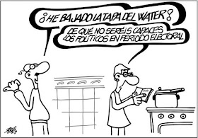 Y cuando ya quedan pocos días para votar, entre otras cosas, representantes en Europa, puede servir de oportuno colofón para esta colección de 51 (+2) viñetas la geopolítica reflexión del neerlandés Tom Janssen. Cui prodest?P.S.- Quizá sea en estos broncos tiempos de campaña cuando más se echa en falta la maravillosa capacidad que tenía Forges de devolvernos a las menudencias cotidianas (viñeta publicada en El País del 6 de enero de 2008). Con el reunimos en apunte 22 humoristas nacionales y 15 extranjeros. Una cifra récord en esta serie.