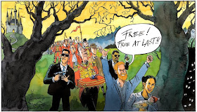 Ante semejante escasez, se nos ocurre que el país que exportó el ¡HOLA!, bien que convertido en HELLO!, al Reino Unido, merece una información más completa sobre el humor que ha generado la rupturista decisión de los duques de Sussex. Comenzamos el recorrido con una muestra de las caricaturas de la pareja realizadas por dibujantes británicos (limitamos a una viñeta la presencia de cada uno): Peter Brookes, Paul Thomas, Ben Jennings, Martin Rowson, Bob Moran, Peter Schrank, Christian Adams, Graeme Bandeira, Patrick Blower, Morten Morland (en el CLIPDA del próximo lunes volveremos sobre esa recreación de un famoso fresco de Masaccio) y Brian Adcock.