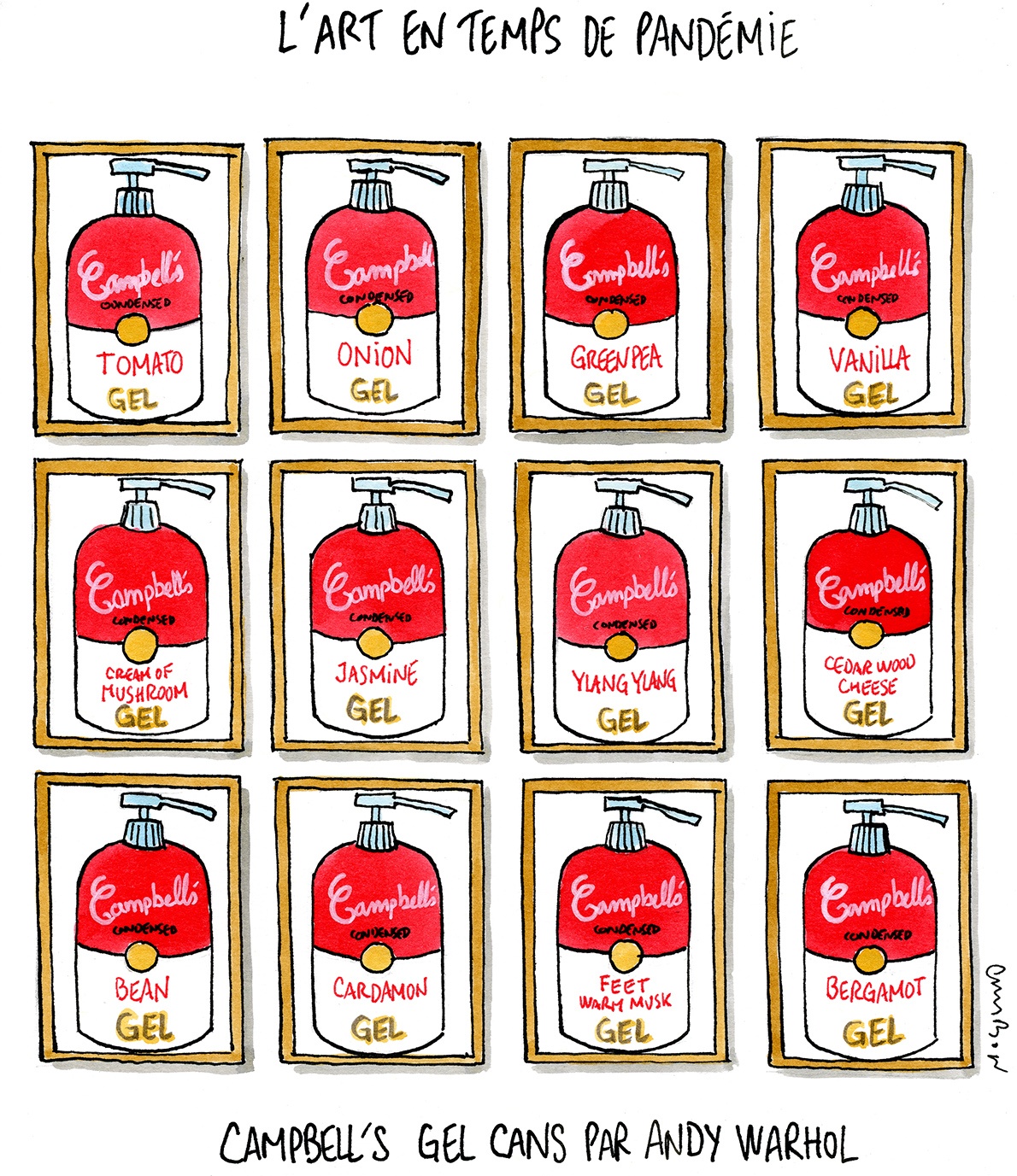 La siguente recreación artística de Cambon, última que tenemos registrada por el momento, comportó un radical salto al arte pop para aportar a esa pandémica colección una warholiana visión del los omnipresentes productos de limpieza de manos.La última pieza aportada por el dibujante francés a esta interesante coleción es una confinada versión de 'Los jugadores de fútbol' (Les Joueurs de football, 1908) de Henri Rousseau. Enlazamos la página de Le Journal des arts en la que puede verse completa la tercera entrega de la serie "El arte en tiempos de pandemia". Y en los que siguen encontrarán la primera y la segunda.