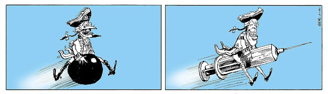 Gallego y Rey pusieron la primera nota literaria en el humor español de esta semana con una evocación de la famosa cabalgada del barón de Munchausen a lomos de una bala de cañón. [2]