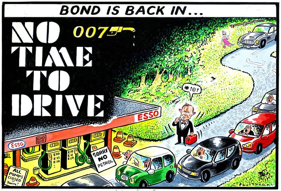 Paul Thomas fue el primer dibujante a quien vimos asociar la figura del agente 007 con el desabastecimiento de gasolina que sufren las estaciones de servicio del Reino Unido. 'No time to drive' tituló la parodia publicada en el Daily Mail del pasado sábado.