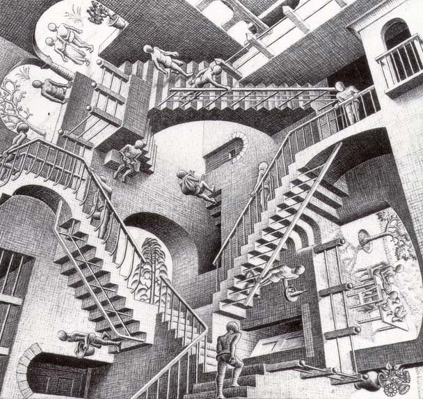 El dibujante belga Nicolas Vadot apoyó en la muy recreada Relativity (1953) de M.C. Escher su visión en el diario L'Echo de la estrategia sanitaria europea (caso de que tal cosa exista). Y la estrategia española podría incluso superar los tres campos gravitacionales ortogonales presentes en el famoso grabado.