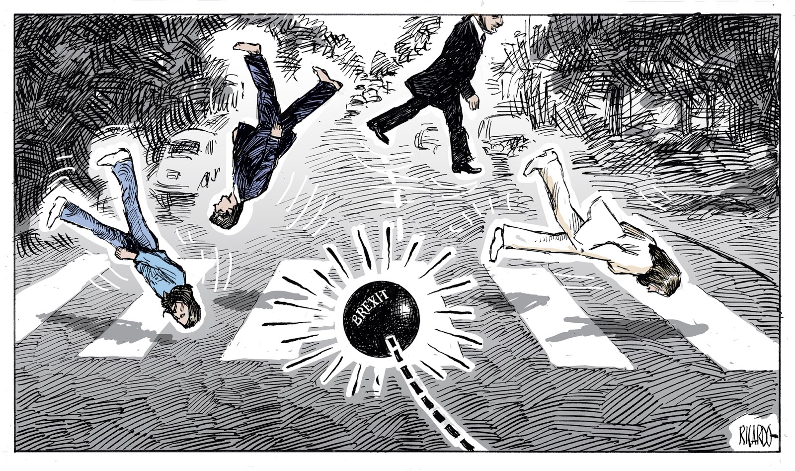 Concluimos con la viñeta de Ricardo del domingo sobre los problemas del rey emérito con la justicia británica. Una pieza inspirada en ese recreadísimo icono que es la portada de Abbey Road, que presentamos acompañada por la versión que el propio Ricardo publicó en septiembre de 2019, también en el diario El Mundo, para señalar el inminente brexit.