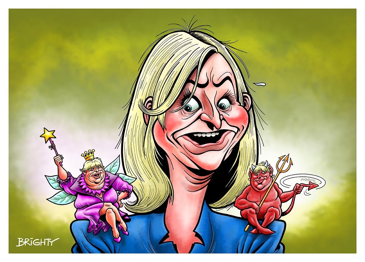 Contrapuestos Boris Johnson sobre los hombros de Liz Truss en la viñeta de Brighty en The Sun del lunes 29.