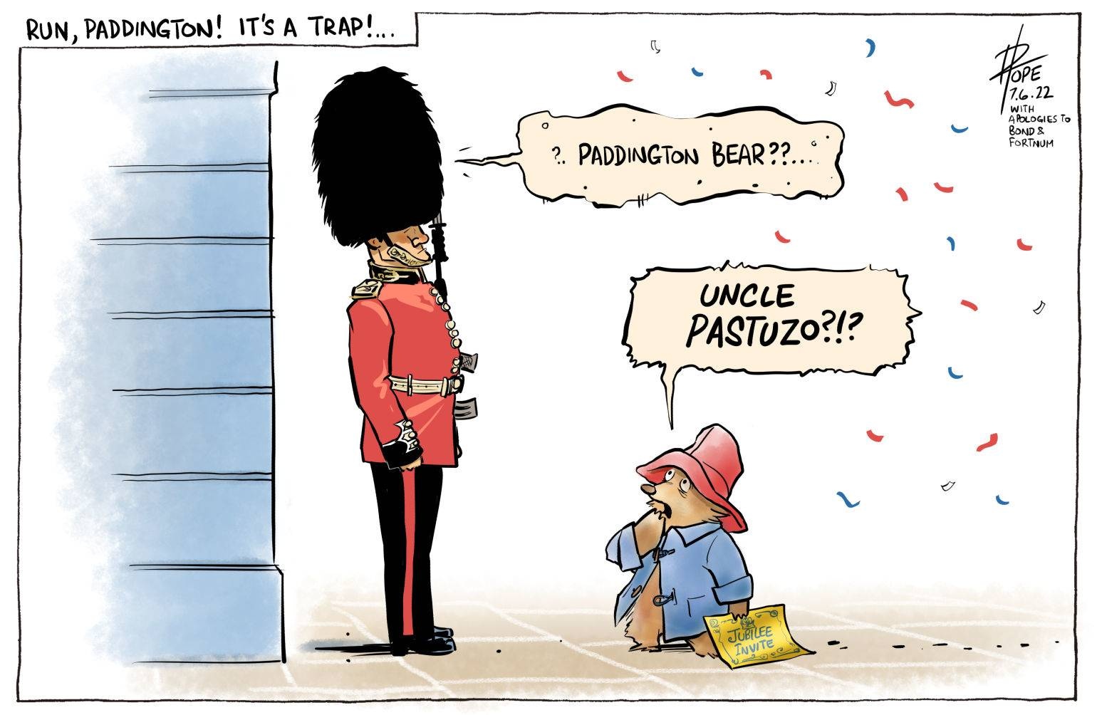 En Humor de cine y tv de junio 2022 (1ª parte) mostramos varias viñetas sobre el sketch interpretado por Isabel II con la cinematográfica versión del oso Paddington, el popular protagonista de la exitosa colección de libros del escritor Michael Bond. Hoy añadimos el dibujo el australiano David Pope que toma como fuente las ilustraciones de Peggy Fortnum para mostrar la preocupación del personaje ante el posible destino de su tío Pastuzo. Y es que la piel de oso es el material con que se confeccionan los icónico gorros altos, precisamente conocidos como bearskins, del uniforme de gala de los Foot Guards. Nos traemos el oso de Morten Morland a modo de contraste.