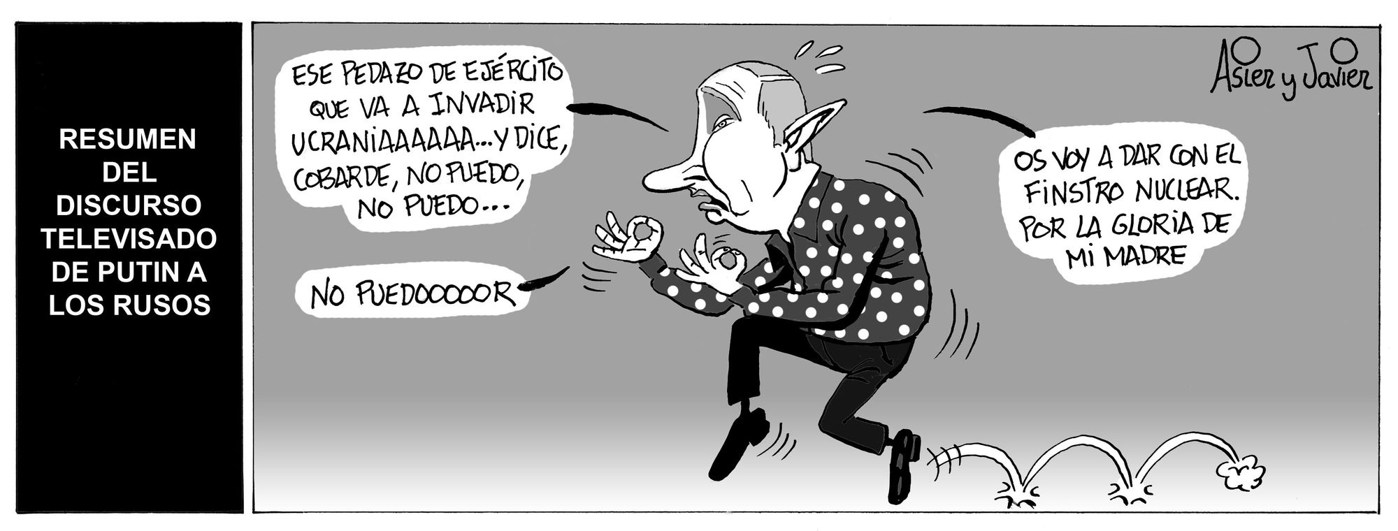 Asier y Javier chiquitearon ayer el discurso televisado de Putin en que anunció el llamamiento a filas de 300.000 ciiudadanos y amenazó, nuevamente, con el recurso a las armas nucleares. Buena ocasión para recordar también la interpretación de Chiquito de la Calzada que encomendaron Odón Elorza en su tira del 12/11/21.