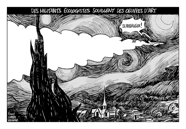 El suizo Vincent optó por sumarse el mismo a la protesta, pero con el razonable recurso a un ensuciado virtual de 'La noche estrellada' de Van Gogh publicada en el diario Le Courrier del día 25 (Militantes ecologistas manchan obras de arte) que nos ha recordado la distópica versión de ese cuadro de Glen Le Lievre comentada en el CLIPDA DLXV. Debajo, la visión en esa misma línea, aunque sin cuadro famoso de por medio, del dibujante italiano Emanuele Del Rosso. Peter Kuper también escenificó una agresión perpetrada por la industria, mientras que la visión de la francesa Piet invita a reparar en que hay países en que los activistas se cuidan muy mucho de enredar.