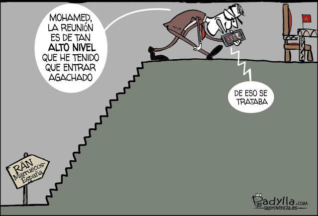Cinco viñetas sobre Marruecos recopilamos el jueves y una decena al día siguiente. Particularmente destacable resulta la ironía de Tomás Serrano sobre la llamada con que se trató de disimular el patente desplante que supone que, por primera vez en una de las seis Reuniones de Alto Nivel celebradas entre España y Marruecos, el monarca alauita no haya recibido al Presidente del Gobierno español. Siguen la visiones de Padylla y Peridis, esta  ya comentada con detalle en el apunte precedente, más un espejismo de ayer de Miki y Duarte y la foto oficial de la cumbre de JL Martín en La Vanguardia de hoy (que no ha necesitado exagerar algunas imágenes que realmente se han visto).