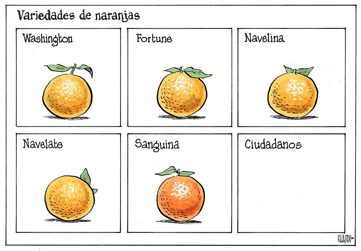 Llegamos a lo publicado hoy. Vergara encabeza nuestra recopilación desde eldiario.es con una gallinácea versión del icónico final de las historietas de Lucky Luke. Ferreres evoca en Ara el famoso desnudo de Albert Rivera [1] para el cartel lanzamiento del partido en 2006. Sigue una aeronaútica metáfora de Javi Salado, la irónica visión de Oroz sobre la libertad de voto ante la renuncia a presentarse a las Elecciones Generales y el socarrón recordatorio de Sansón de algunas otras desparecidas ofertas políticas nacidas con vocación de bisagra.