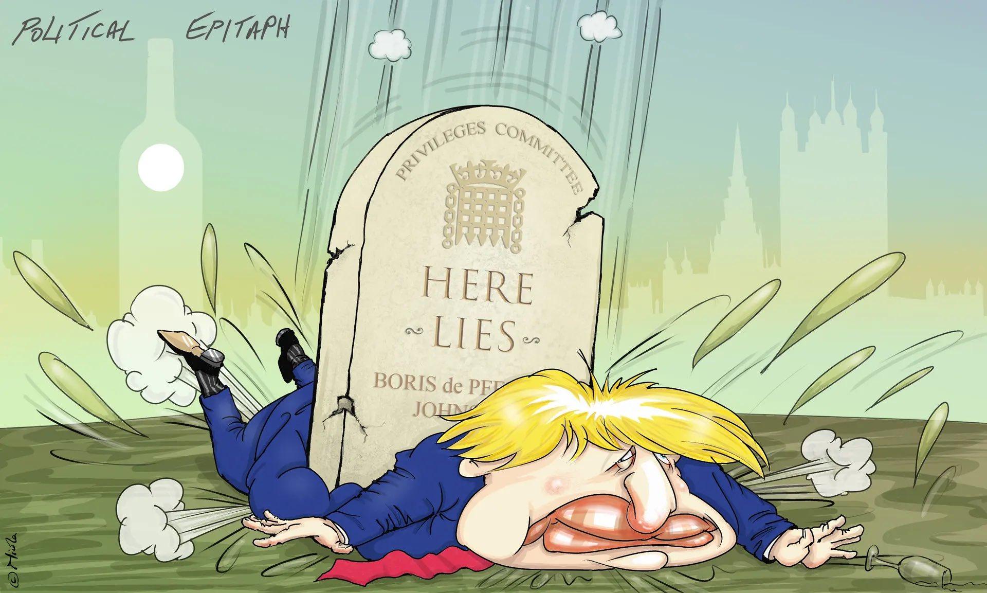 Concluimos esta colección de 80 viñetas en dos entregas (31 + 1 y 41 + 7) con dos viñetas de hoy mismo sobre la dimisión de Boris Johnson como diputado formalizada horas antes de la publicación, prevista para hoy, del informe que concluye que mintió al parlamento: Nicola Jennings se apoya en The Guardian en un dilógico epitafio con lies (yace / miente) y Morten Morland escenifica en The Times el brabucón final del exprimer ministro. Pero nos son pocos quienes todavía no dan por acabada su trayectoria política.