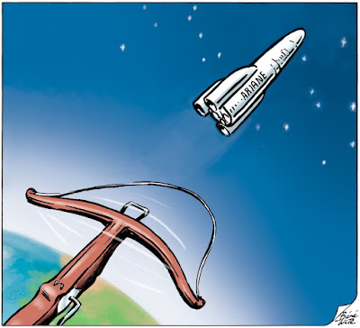 Proseguimos con la evocación de la legendaria figura de Guillermo Tell en la viñeta de la suiza Bénédicte sobre el lanzamiento del nuevo cohete Ariane que cuenta con componentes helvéticos.