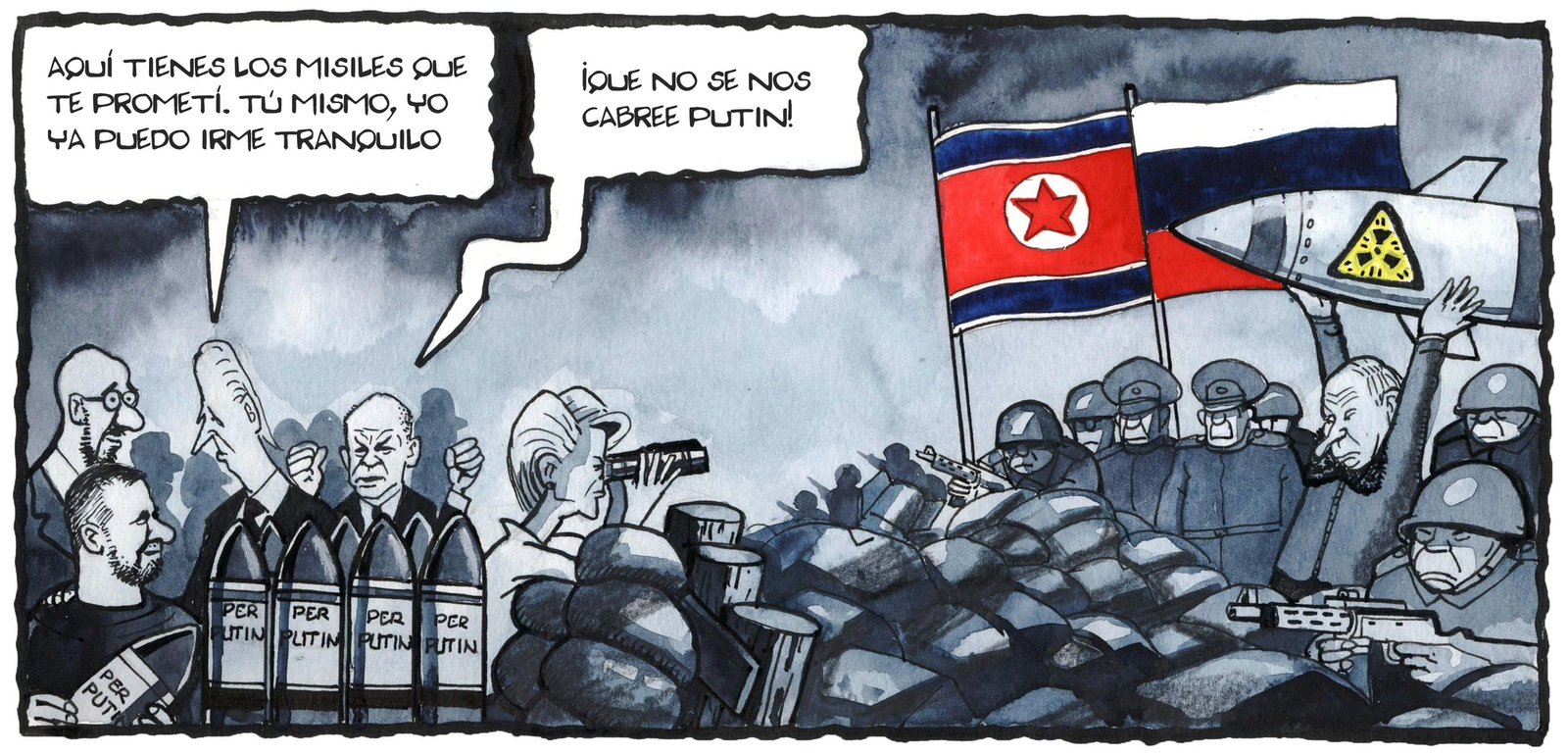 Miki y Duarte reeditan hoy un apocalíptico argumento que ya vimos en una tira de Oroz reseñada en el apunte del jueves, Ferreres se ocupa de la guerra de Ucrania y conluimos esta colección de 44 viñetas que complementan las 56 de la primera parte con la caricatura de Putin que hoy publica Morten Morland en The Times.