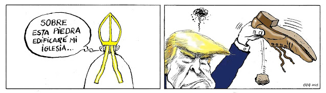 Idígoras y Pachi encabezan esta nueva recopilación con la viñeta que pone el colofón al apunte Cosplays papales de Trump. Gallego y Rey, Asier y Javier y Nani, con un dibujo coincidente con el del francés Chaunu reseñado en el apunte del domingo, son los autores de las otras viñetas con papa que coleccionamos en la prensa española del lunes. JM Esteban completa este primer bloque con una mera referencia papal.